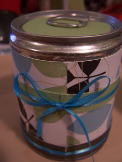 I found a site, using Stumble! that showed how to make cans more gift-like. So here they are....a gift can. Inside are Peanut Butter M&M's or Regular M&M's depending on who which can is for. I think they are cute and a nice gift, that clearly took time to make (not to mention money? I didn't expect it to cost as much as it did, but since I didn't have the cans I had to buy canned fruit, and empty the cans-without wasting the fruit- and I also had to purchase special glue to re-glue the metal on the bottom, luckily my grandmother had the special can opener, which would have added up to $21...) But, they turned out nice, and I can't wait to see the faces of the people who will receive them!